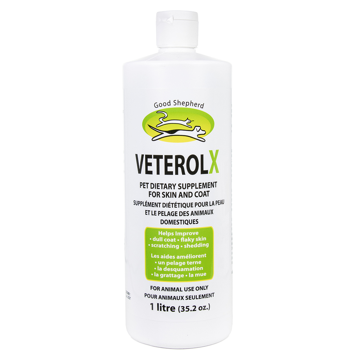 Veterol X is a pet dietary supplement for skin and coat that contains a balanced formulation of essential fatty acids. Help to improve dull coat, flaky skin, scratching and shedding. Each 250 mL (8.8 oz) of VETEROL-X pet dietary supplement contains: Linoleic acid 75.0 g - 30.0% Linolenic acid 12.5 g - 5.0% Oleic acid 16.5 g - 6.6% Phosphatidyl choline 25.0 g - 10.0% Phosphatidyl inositol 25.0 g - 10.0% Daton 24 15.0 g - 6.0% Vitamin E 50.0 I.U.