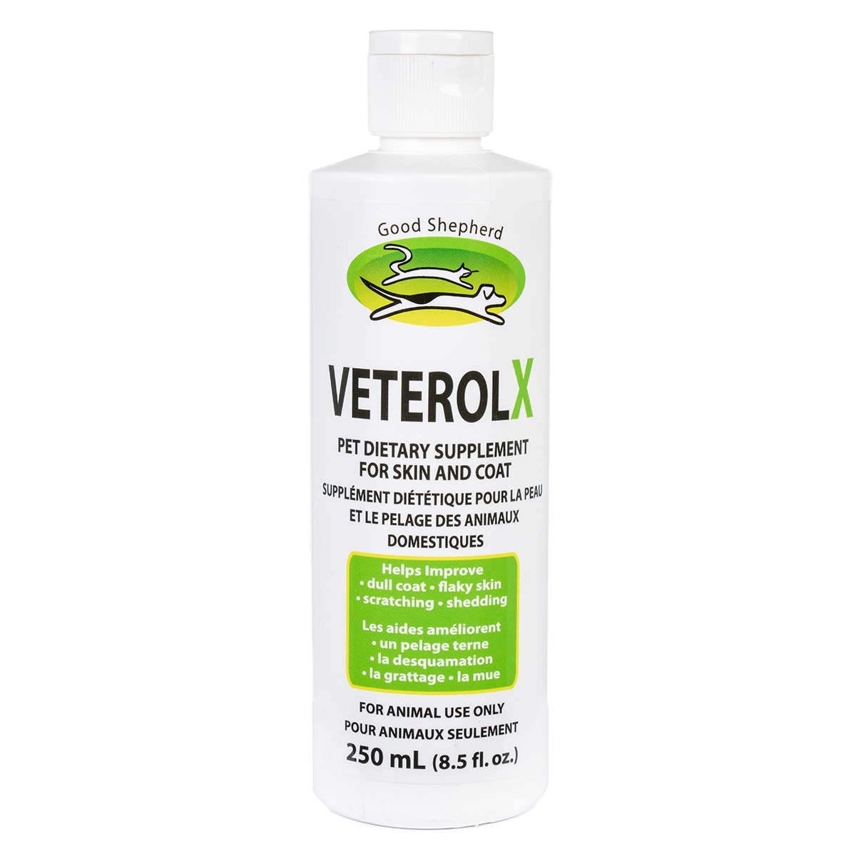 Veterol X is a pet dietary supplement for skin and coat that contains a balanced formulation of essential fatty acids. Help to improve dull coat, flaky skin, scratching and shedding. Each 250 mL (8.8 oz) of VETEROL-X pet dietary supplement contains: Linoleic acid 75.0 g - 30.0% Linolenic acid 12.5 g - 5.0% Oleic acid 16.5 g - 6.6% Phosphatidyl choline 25.0 g - 10.0% Phosphatidyl inositol 25.0 g - 10.0% Daton 24 15.0 g - 6.0% Vitamin E 50.0 I.U.