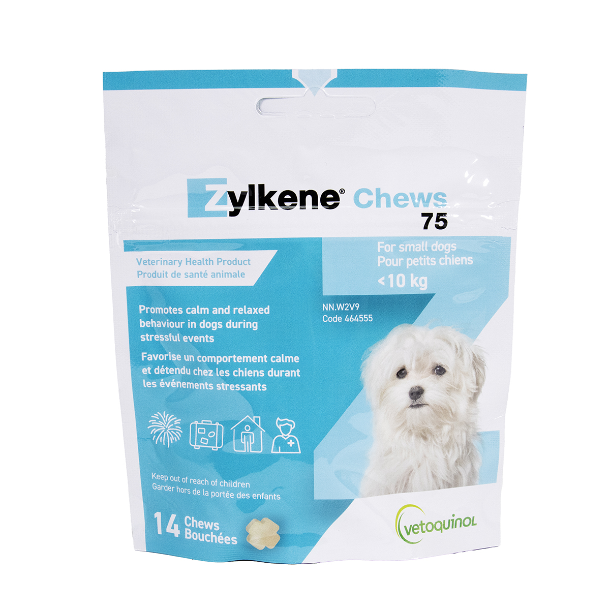 Promotes calm and relaxed behaviour in dogs during stressful events, such as travel, thunderstorms, fireworks and veterinary visits. Zylkene Chews 75 contains an ingredient of natural origin derived from milk protein which has calming properties. RECOMMENDED DOSE: Dogs weighing Less than 5 kg 1 chew once a day 5 kg to less than 10 kg 2 chews once a day Administer by mouth, 1-2 days before the predictable event (e.g. travel, thunderstorms, fireworks and veterinary visits). Water should be available at all times. The daily dose can be adapted as recommended by a veterinarian.